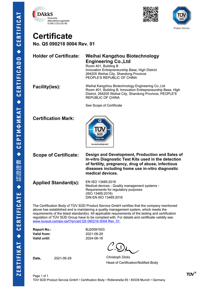 ? ? ?威海康州生物工程有限公司成立于2013年,公司坐落于風(fēng)景秀麗的海濱小城——威海市。康州生物是集研發(fā)、生產(chǎn)和銷售于一體的生物科技公司,與威海哈爾濱工業(yè)大學(xué)合作研發(fā)團(tuán)隊(duì),擁有先進(jìn)的科研基地及生產(chǎn)基地。主要從事快速診斷檢測(cè)產(chǎn)品的研發(fā)、生產(chǎn)、銷售。產(chǎn)品涵蓋:生育檢測(cè)、藥物濫用檢測(cè)、農(nóng)藥殘留檢測(cè)以及其他臨床診斷檢測(cè)等。公司自主研發(fā)生產(chǎn)得早早孕試紙,排卵檢測(cè)試紙,毒品檢測(cè)及疾病檢測(cè)等醫(yī)用產(chǎn)品,經(jīng)過歐盟認(rèn)證,產(chǎn)品質(zhì)量穩(wěn)定,值得信賴。
